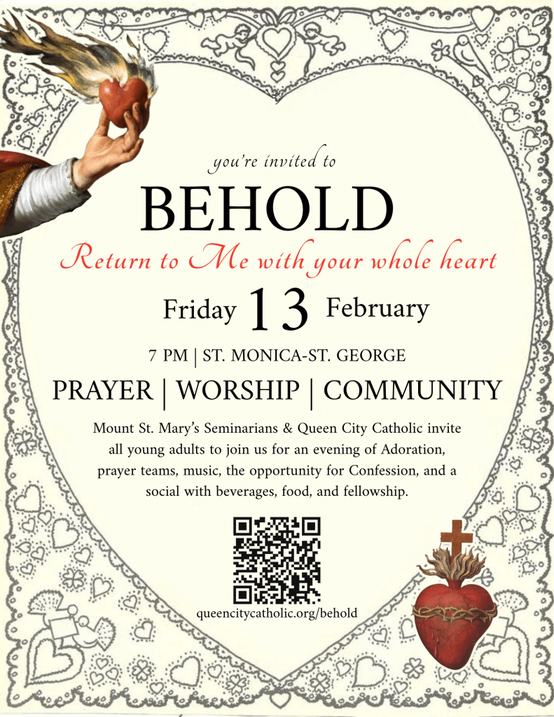 SACRED MUSIC INSTITUTE AT MOUNT ST. MARY’S SEMINARY & SCHOOL OF THEOLOGY – The Sacred Music Institute at Mount St. Mary’s Seminary & School of Theology will be hosting Solemn Vespers on Sunday, February 15 and Sunday, March 22 in the Chapel of St. Gregory the Great, each beginning with an organ recital at 6:30 p.m. followed by Solemn Vespers at 7:00 p.m. On Sunday, April 12, MTSM will host its annual Eastertide Choral Mass, featuring an organ recital at 6:30 p.m. with Mass beginning at 7:00 p.m. Admission to all events is free and open to the public. For more info, please visit www.athenaeum.edu/smi.