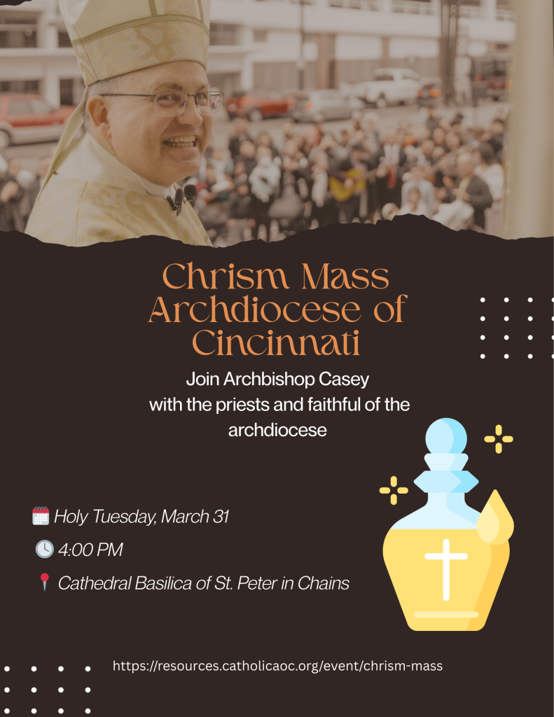 SAVE THE DATE! CATHOLIC DAY AT GREAT AMERICAN BALLPARK ON SATURDAY, SEPTEMBER 5 – The second annual Catholic Day at Great American Ballpark will be held on Saturday, Sept. 5, 2026, which is the Saturday of Labor Day weekend. The Cincinnati Reds will host the Milwaukee Brewers that evening. More details will be announced soon.